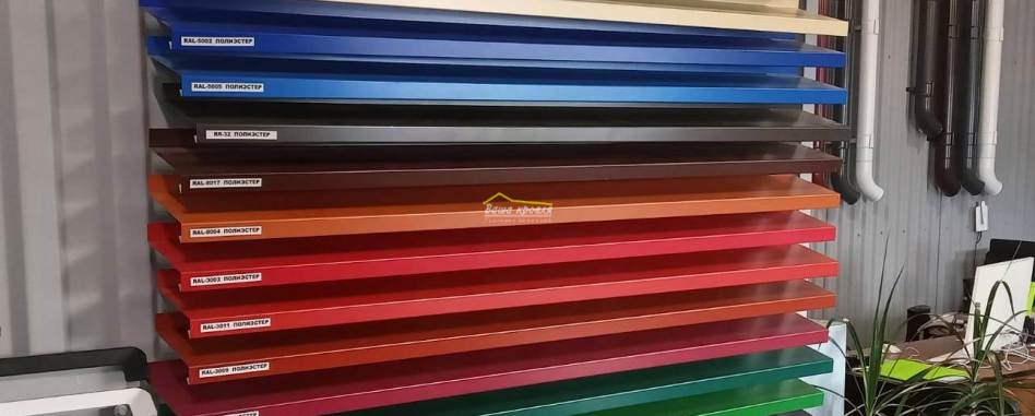 На складе в наличии мы держим металл более 40 цветов: с глянцевым покрытием (Полиэстер, Satin), с матовым покрытием (Drap, Satin matt), с рисунком под "Дерево" и "Камень".